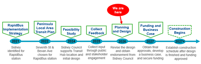 BC Transit and the Town of Sidney then conducted a feasibility study for building the Transit Hub at the intersection of Seventh Street and Bevan Avenue and the concept was then supported by Sidney Council in June 2024 and the VRTC in November 2024, which initiated the design phase that we are in now.